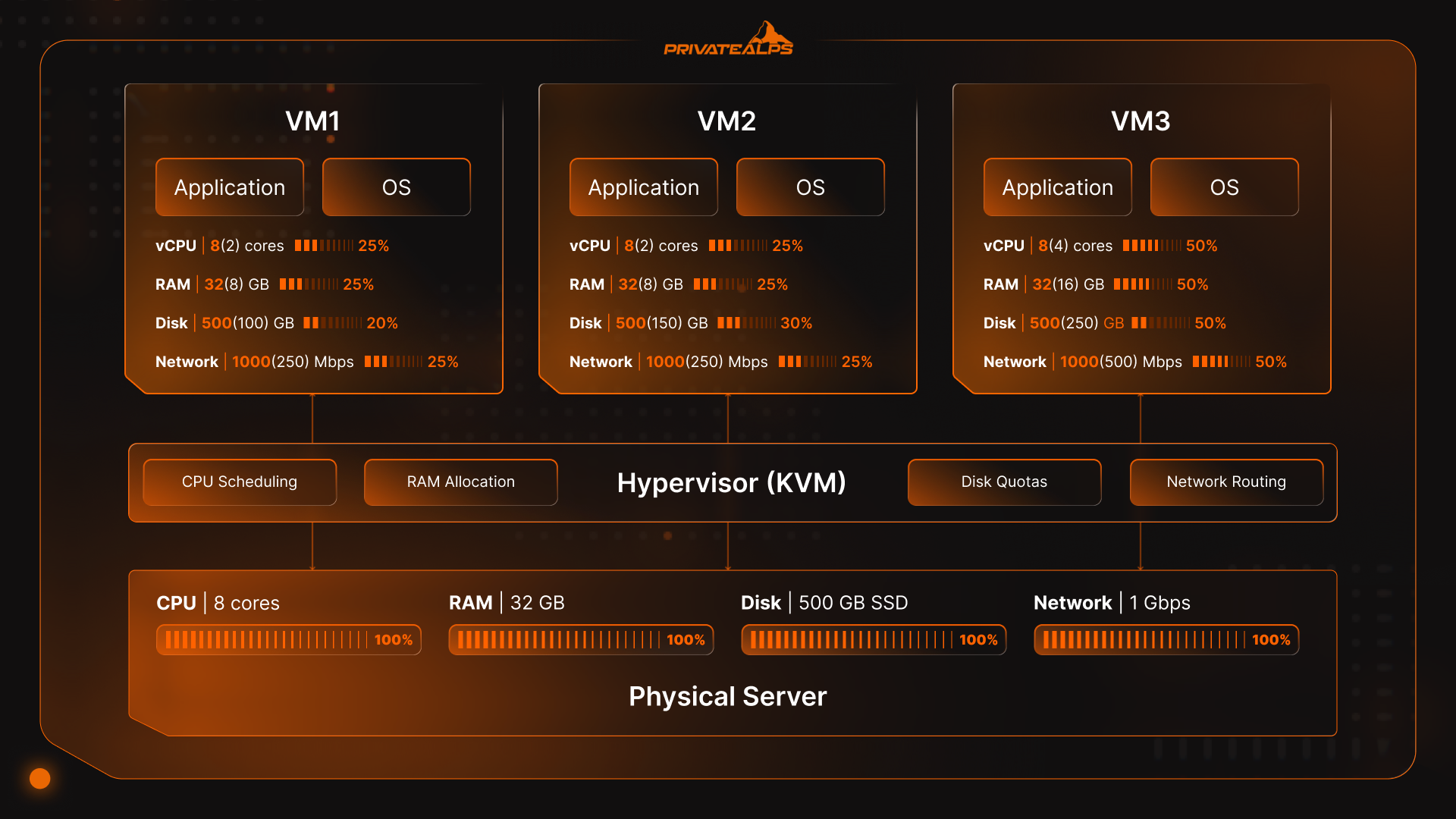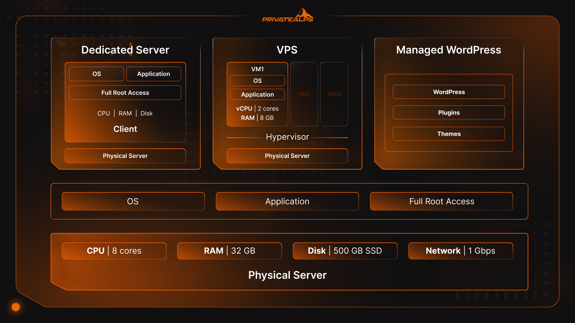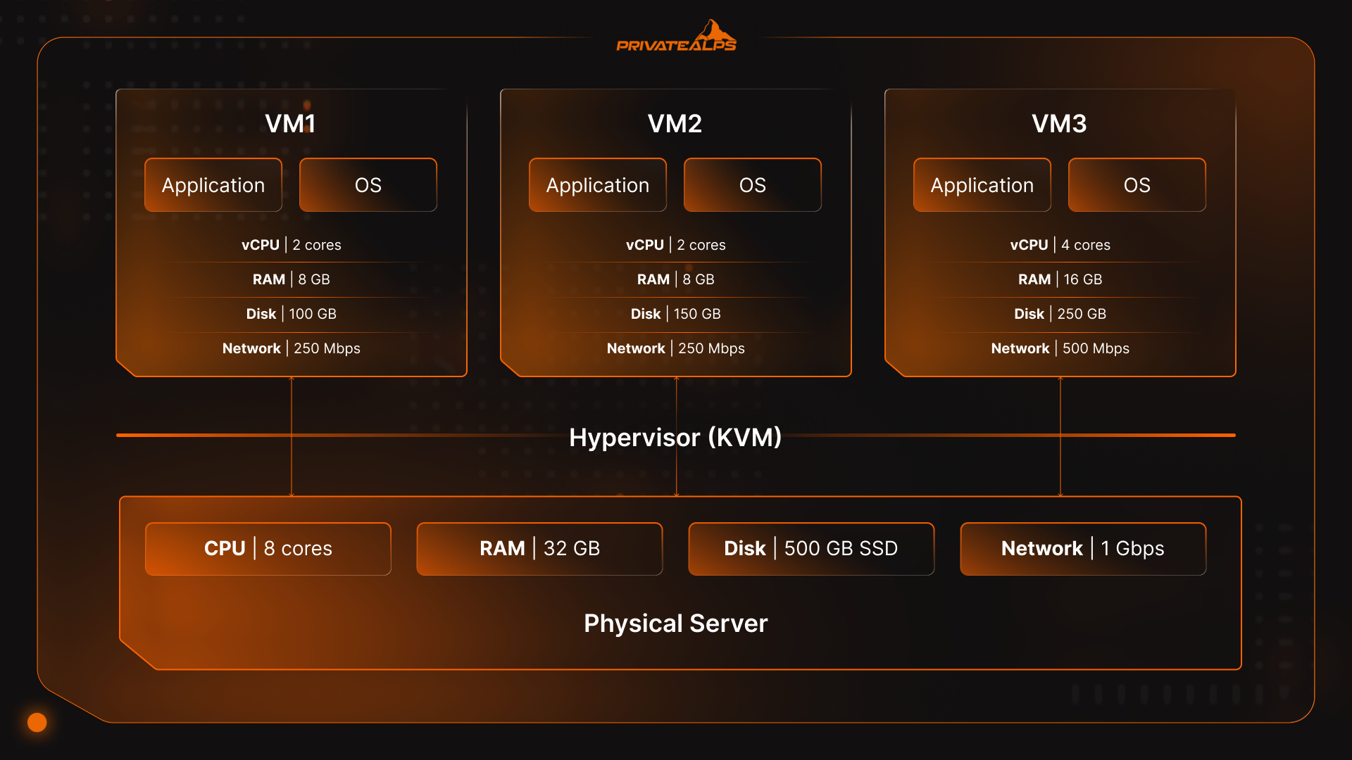 A VPS is a virtual machine carved out of physical hardware using virtualization. You get your own operating system, your own CPU and memory limits, your own disk and network slice. Not shared accounts. Not folders. An actual server environment you control.